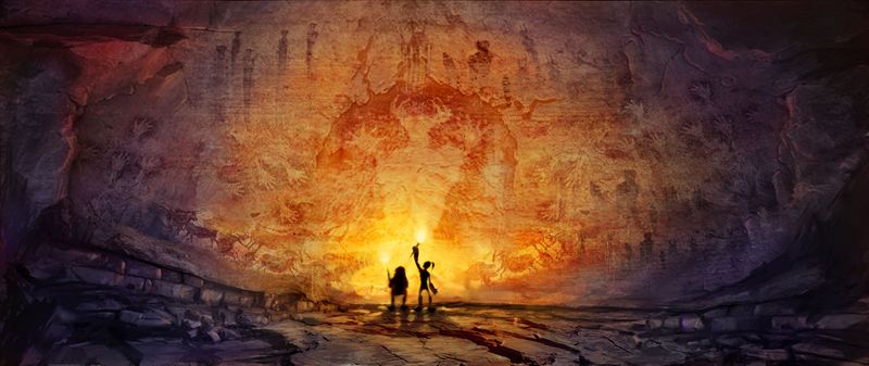 The painting depicts two figures holding bright yellow burning torches, silhouetted against a much larger natural stone wall covered in rockart. The figure on the right strongly resembles Abe, while the figure on the left is shorter (only coming up to Abe's chin) and has a much broader body with no discernible neck. The floor on which these figures are stood is mostly flat but with large fissures, and slopes upwards on either side.